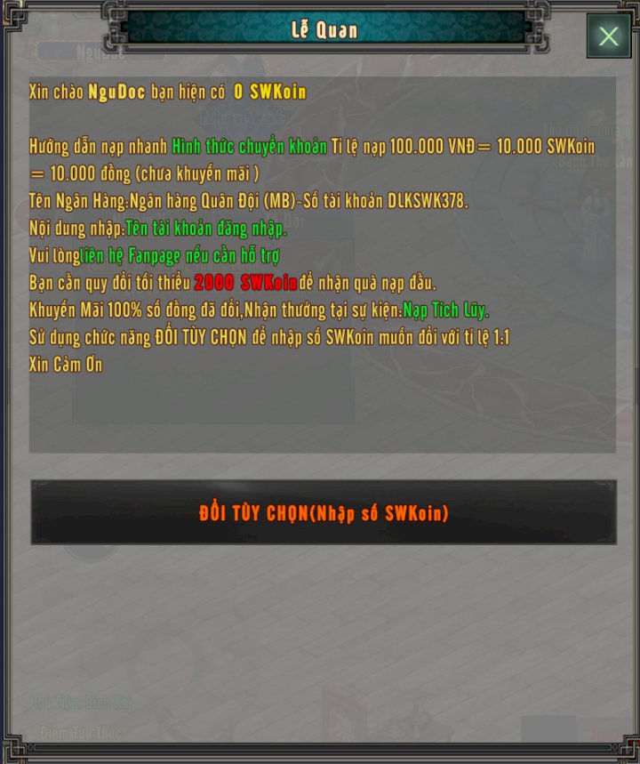 Khi đã nhận được SWKoin người chơi vào game tìm NPC Lễ Quan chọn đổi đồng