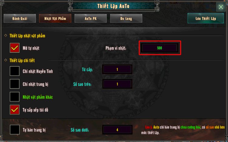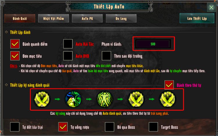 Phần Đánh Quái thiết lập phạm vi đánh ( khuyên dùng thiết lập phạm vi 500 )