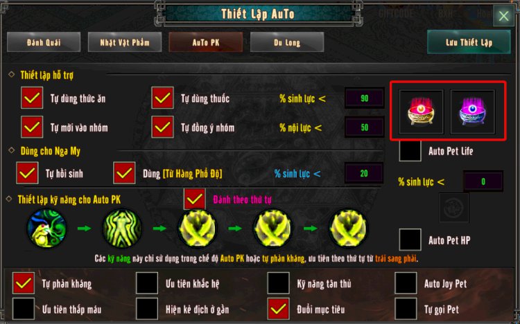 Thiết lập chiêu thức PK vào dấu “+” và chọn đánh theo thứ tự