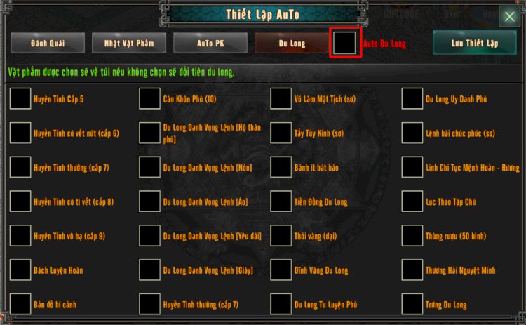 Auto hoạt động Du Long tích vào phần thưởng cần giữ lại nếu không tích sẽ đổi thành tiền du long.