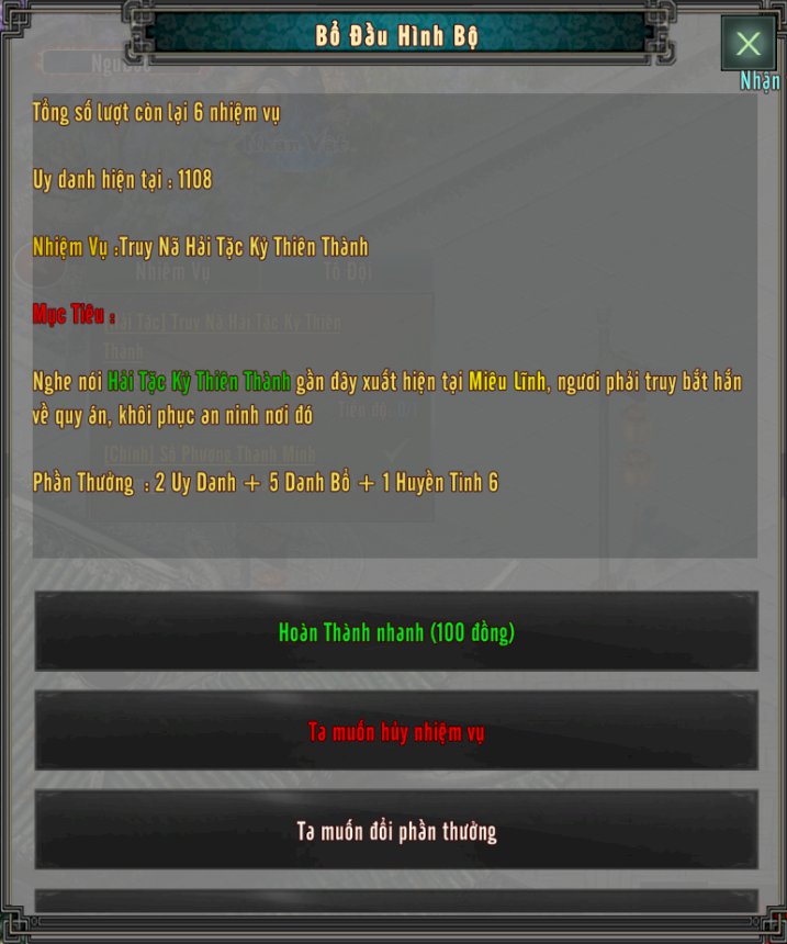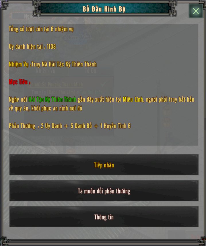 Hoàn thành các nhiệm vụ sẽ nhận được Uy Danh, Danh Bổ Lệnh và Huyền Tinh.