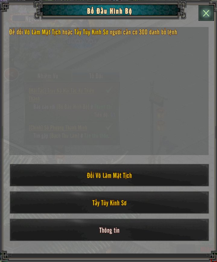 Dùng Danh Bổ Lệnh đổi lấy Võ Lâm Mật Tịch hoặc Tẩy Tuỷ Kinh Sơ tốn 300 Danh Bổ Lệnh cho mỗi loại.