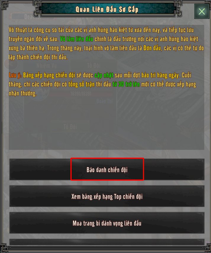 Chọn Báo danh chiến đội sau đó nhập tên chiến đội rồi chọn đồng ý