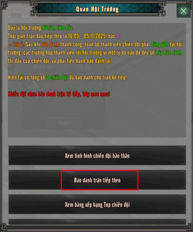 - Khi thời điểm các trận đấu bắt đầu, tới gặp NPC Quan Hội Trường để tiến đăng ký thi đấu ( Lưu ý phải tạo đội mới được quyền báo danh trận tiếp theo )